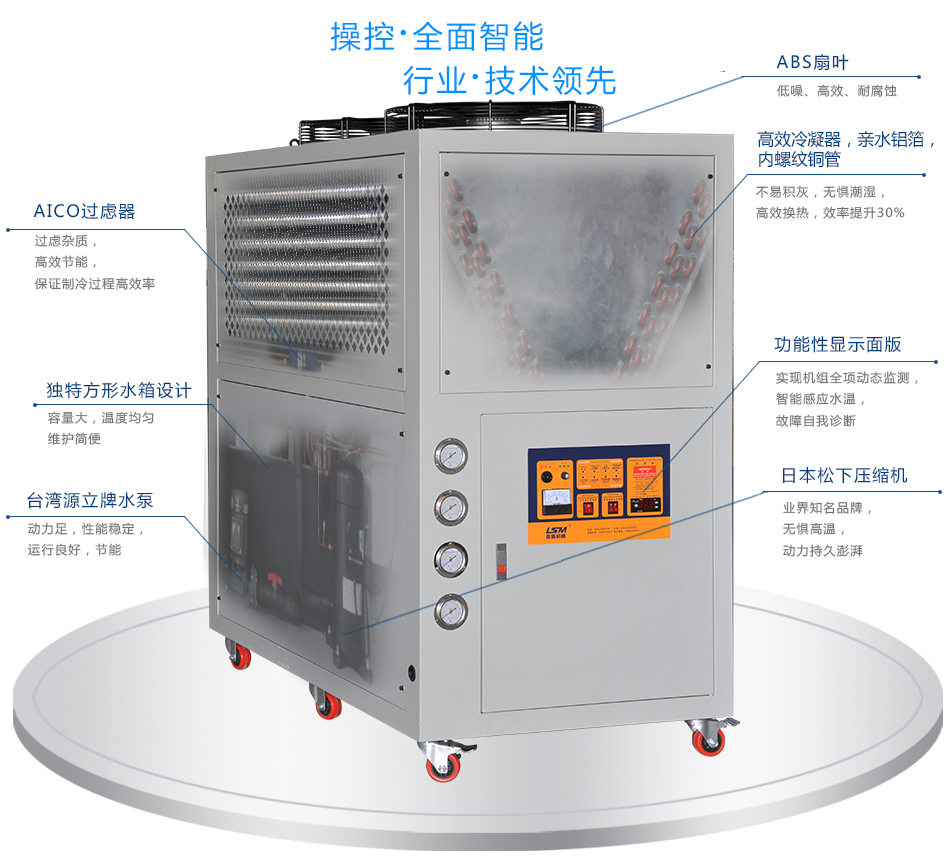 7、風(fēng)冷機(jī)制冷機(jī)組是工業(yè)冷水機(jī)型號(hào)規(guī)格之一,將常溫下的水根據(jù)工業(yè)冷水機(jī)的制冷壓縮機(jī)致冷到一定的溫度以加強(qiáng)制冷磨具或設(shè)備,做為單機(jī)版應(yīng)用,熱管散熱為內(nèi)嵌之散熱風(fēng)扇,關(guān)鍵有三個(gè)互相聯(lián)絡(luò)的系統(tǒng)軟件:冷媒呼吸系統(tǒng)、循環(huán)水系統(tǒng)、家用電器自動(dòng)化控制系統(tǒng)軟件。